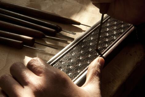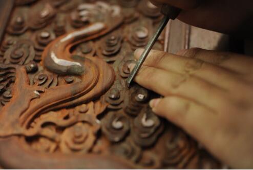 积庆堂用以材入工的独特设计,造就了手作自然天成又妙趣横生。作品尺幅会因木材的材质、机理的不同而不同。比如印度小叶紫檀古老木建筑的老房料,油性重、密度高、声如金属,匠师发挥起来容易线条干净利落,雕刻得心应手。而紫檀料幼成长很慢,加上弯曲空心白皮烂肉居多,往往难得大材,得如此稀世奇珍重铸经典、延续传奇,是难得的缘份。匠师根据这些木材的特性,塑造了紫檀四面平螭龙书案、拐子龙纹扶手椅、雕花长桌、书案、冰梅纹条案、绳纹条案等名作,木材打磨至如丝手感,散发着岁月的芬芳和行云流水般的家具意境。积庆堂的画案就极富明清古意,观赏其间,仿佛能够触摸到古人書畫時的风雅。 人手:自然天成 如果说心造,是积庆堂的艺术态度;那么纯人手,则是积庆堂修炼内功的外化手段了。 从木材质地的甄选、开料,到打磨、雕刻、拼板,每一件艺术级作品,都是一次追求,,的探索与远足。 从选料伊始,匠心就融入其间。衡量完产品质地及结构,匠师便筛选出与之材质、尺寸、气质相匹配的原料,再根据木材原本的弧线、弯度进行开料。 雕刻和打磨是手作制品的灵魂环节。根据木材本身的高下、起伏、圆胖、钩锭,或偏倚或直接,或传神或干脆或温润,每一笔刀法都带着匠师浓浓的个人韵味与艺术驾驭能力。上百种刻刀,有圆有宽,有大有小,有锐有钝,根据图案的每一根线条配制不同的专用刻刀,千锤百炼,刀刀惊艳。