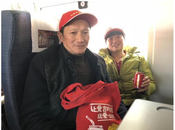 在本次爱心专列上,还有这样一对特殊的夫妻。列车上,来自重庆的鲁振萍(化名)夫妇拿着爱心福袋,笑容满面。他们两人都是第一次坐高铁。今年已经50多岁的鲁振萍,从上世纪九十年代开始就和爱人从老家来到杭州打工,因为文化程度不高,夫妻俩一个在工地上做木工,一个做保洁,工资都不高。“这次多亏王老吉给我们提供了免费回家的高铁票,让我们节省了一大笔开销。”虽然回家的路途很遥远,但是一想到马上就能回家看到儿子儿媳和刚出生不久的孙子,他们仍然感觉很幸福。