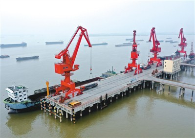3月6日,位于长江安徽铜陵段横港港区的东苑码头,港口机械在进行装卸作业。据了解,随着“一带一路”和长江经济带战略的全面实施,长江黄金水道的地位愈加凸显。铜陵市以“共抓大保护、不搞大开发”为导向,以落实生态环境保护为抓手,不断优化港口布局,积极发展绿色水运,在提升岸线资源利用价值的同时,也助推港口经济加快发展。今年1至2月份该市完成港口吞吐量1414.77万吨。