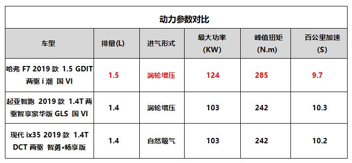 为了更具可比性,方便消费者选择,我们选择的这三款车的具体款型需同时满足以下三个条件:价格都在15万元以内;发动机排量都在1.5L以下(带涡轮增压),并满足“国六”标准;都是各自的两驱主销车型(两驱顶配或次顶配)。为此,我们选择了哈弗F7两驱i潮 、起亚智跑两驱智享豪华版、现代ix35两驱智勇畅享版(下文简称为哈弗F7、智跑、ix35)作为对标车型(见下表)。从这三款车的价格来看,韩系两款车型厂商指导价恰好一样,均为14.49万元,而哈弗F7两驱i潮厂商指导价仅为13.70万元,更显实惠亲民。看到这里,可能有人会问,价格的确更加实惠,关键是哈弗F7能否在动力、颜值、配置上带来更多惊喜?带着这个问题,我们继续往下看。