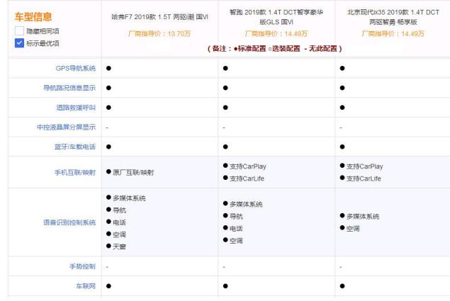 同时,在智能安全配置方面,哈弗F7配备了诸如ACC自适应巡航、AEB自动刹车系统、TSR交通限速标志智能识别、DOW开门预警、驾驶疲劳探测等智能安全功能,以全面周到的智能安全配置,为驾乘者提供了更为可靠的主动安全,而以上这些新功能,并未成为智跑和ix35的标配(见下表),让消费者略感遗憾。