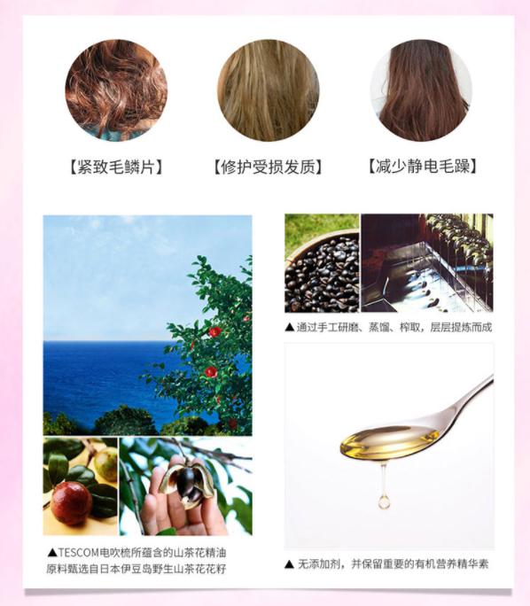 原料甄选自日本伊豆岛野生山茶花花籽,萃取纯粹植物精华,通过手工研磨、蒸馏、榨取,层层提炼而成。无添加剂,保留重要的有机营养精华素。精油热风吹出率提升,抚平毛躁力UP,山茶花精油独特滋润功效,抚平毛鳞片,锁住水分。吹干头发同时抚平毛躁,辅助造型。