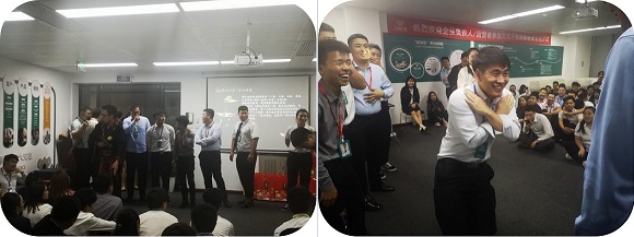 然后就是深受大家喜爱的传话筒游戏,每个区域派出了8位战友,共分为5组,每组进行猜词,猜对或用时最短则获胜。每组对词的形体表演各有千秋,有的表达形象传神,而有的则被大家调侃为“猪队友”,搞笑的动作层出不穷,整个活动场欢笑不断,处处欢声笑语。我们的总监们也被游戏吸引,由管理层组成的猜词团队就应运而生,各位总监生动的表演,也让大家开怀大笑。