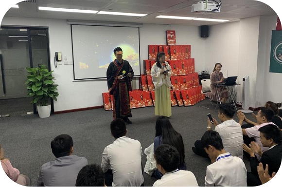 活动开始,两位主持人身着汉服,伴随着《花好月圆夜》的背景音乐和大家的热烈掌声上场,为大家带来了满满的中秋祝福。