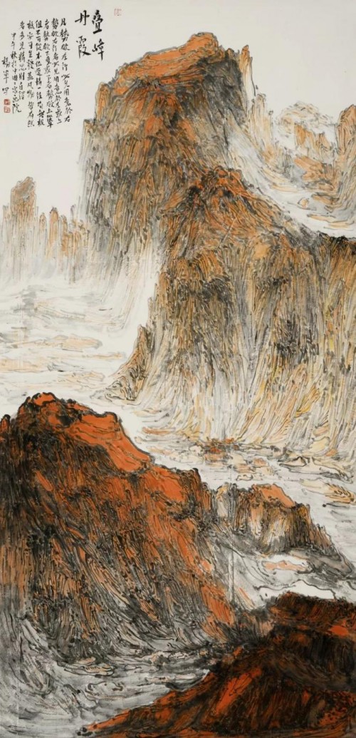 识文:叠嶂丹霞,凡势欲左行,必先用意于右,势欲右行者必先用意于左,或上者势欲下垂,或下者势欲上纵耳,且不可从本位尽情一往,苟无根柢,安可生发,盖凡物皆有然者多见精思,则自得。