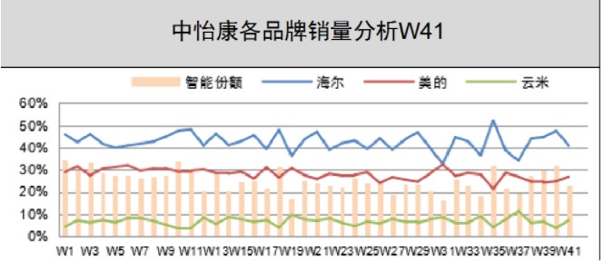 从第41周市场销量数据来看,智能冰箱市场增幅稳定,海尔、美的、云米稳居前三名,市场份额分别占比40.87%、26.87%、7.28%。三家销量总计超过整体市场份额的3/4。