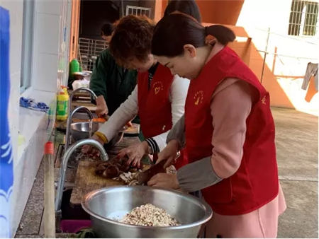 随后,志愿者们和老人们一起包起了饺子。洗菜切肉、和面拌馅,大家围在桌子边,其乐融融。经过两个小时的忙碌,志愿者们包出了八百多个饺子。