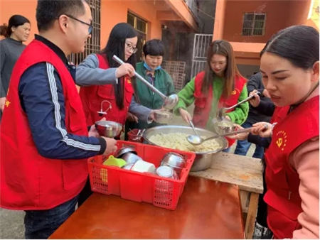 党员志愿者为老人们盛起一碗碗热气腾腾的水饺,为行动不便的老人们端去饺子,亲手送上并嘱付:慢点吃,别烫着。