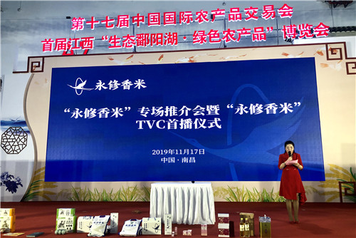 2019年11月17日,“永修香米”专场推介会暨“永修香米”TVC首播仪式在南昌绿地国际博览,举行。省市县相关领导出席推介会并和此次新晋电视广告片主创团队共同启动了TVC播放仪式。