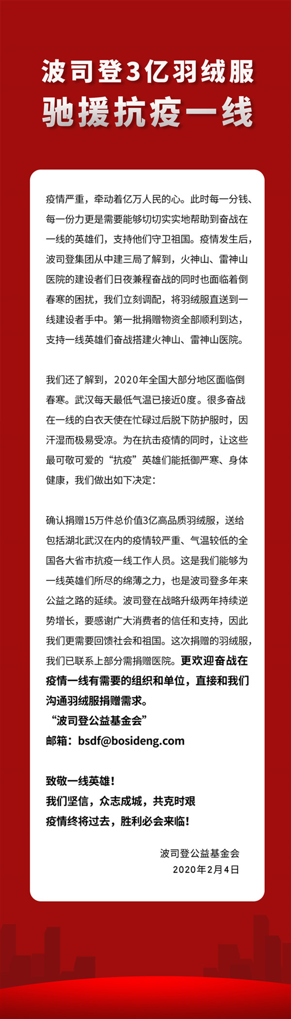 面对新型冠状病毒肺炎疫情,社会各界企业及爱心人士,众志成城,共度时艰。2020年全国大部分地区正值倒春寒,也让抗疫工作多了一分艰苦。2月4日,羽绒服品牌波司登表示,将捐赠15万件总价值3亿的羽绒服,送给包括湖北武汉在内的疫情较严重、气温较低的全国各大省市抗疫一线工作人员,助力一线工作团队打赢疫情防控阻击战。