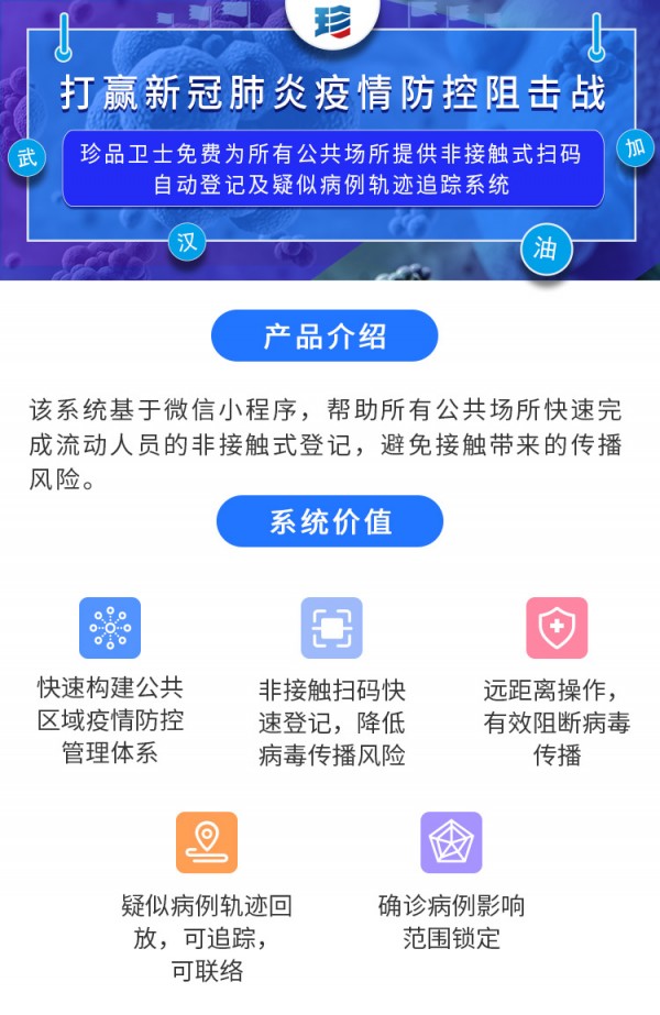 当前,全国各地都在积极防控新冠肺炎疫情,上海易溯科技股份有限公司也在积极行动,推出珍品卫士小程序,免费为公共场所提供非接触式扫码自动登记及疑似病例轨迹追踪系统,避免接触式登记,降低感染风险。