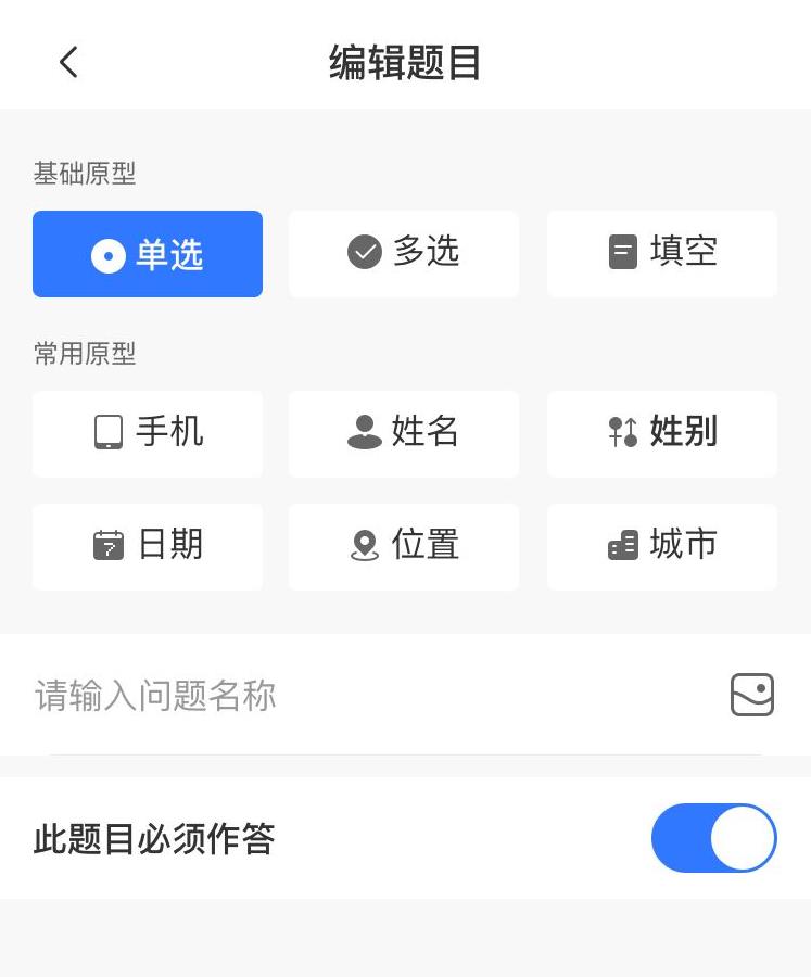将问卷的标题、描述说明填写完成后,点击「添加问题」进入题目编辑页。目前可支持添加单选、多选、填空这三种基础题型,同时还有六种常见的题目原型可供快速选择,包括手机号、姓名、性别、日期、位置以及城市,圈主以及管理员们直接点击选择即可进行使用。