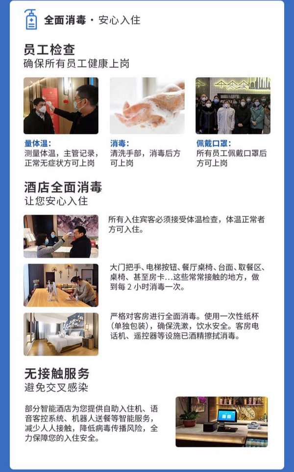 本次“返工安心住”活动,汇集了全国逾2000家品牌酒店的“安心隔离房”,且各酒店均已向属地政府相关部门完成报备,并根据相关防疫要求,备足防疫及消毒用品,严格执行酒店公共区域及客房的消毒防疫制度,并对包括酒店员工在内的所有出入人员实施体温检测、出入登记等安心防疫措施。部分酒店还通过多样化智能设备为客人提供无接触服务,以有效避免交叉感染。