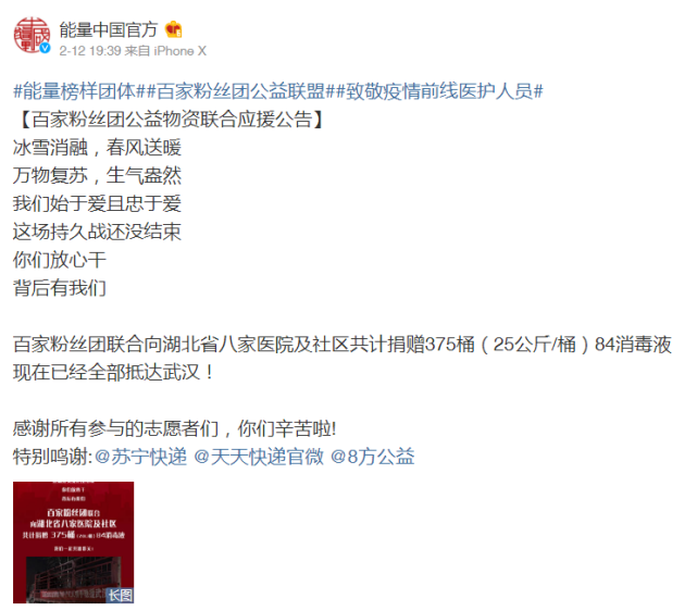 这次,天天快递承运了百家粉丝团向湖北八家医院及社区捐赠的375桶(25公斤/桶)84消毒液,对于粉丝应援来说,他们“始于爱且忠于爱”,对于天天快递来说,是“始于责任,忠于责任”。