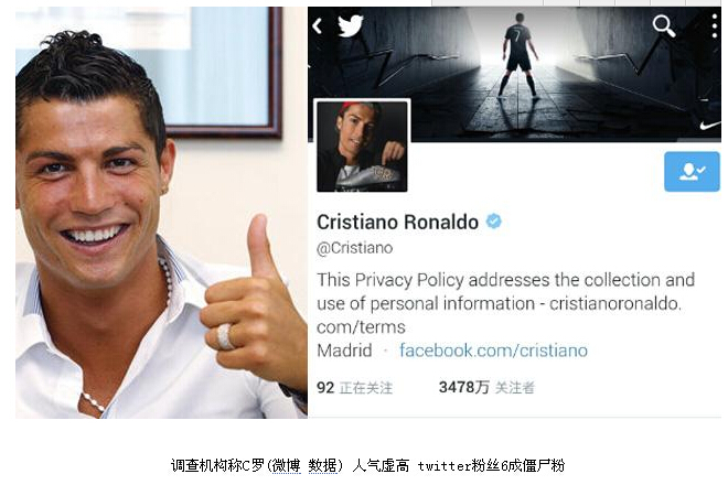 不过,近日有机构做了份调查,在对C罗的推特粉丝审计后发现,其中高达64%的粉丝是“僵尸粉”。也就是说,在C罗的3480万的粉丝中,有近2100万的粉丝都处于非活跃状态。
