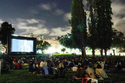 | 秋夜,旧金山不少公园都会开放露天电影供大家欣赏。邀请三五好友,铺着毛毯在草坪野餐看电影,是不少旧金山年轻人在秋天的独特享受。(薛钰洁 摄) |