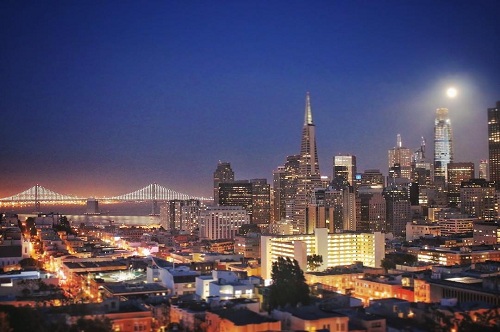 | 在秋夜的微风和月色下俯瞰旧金山夜景,海湾大桥尽收眼底。(薛钰洁 摄) |