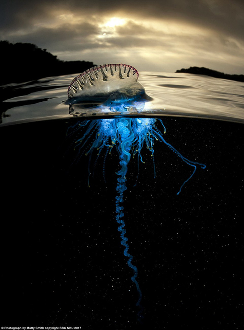 这幅照片由马蒂·史密斯拍摄,照片中是离奇的葡萄牙僧帽水母,此类水母有毒。
