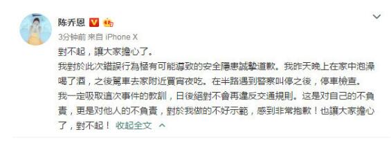 据台媒报道,近年在大陆发展有成的艺人陈乔恩,惊传在台北酒驾遭逮!戴着口罩的她今日(4日)一早近9时遭大安分局依公共危险罪移送台北地检署,检察官讯问后,于上午10时35分依公共危险罪谕令10万元交保候传。而陈乔恩的大陆经纪人则未接电话,至今尚未回应。