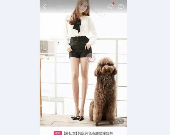 这张来自网拍的截图,可以清楚看模特儿修长的美腿旁,还有1只咖啡色的贵宾狗,但这个比例却引起网友的热烈讨论。因为撇开模特儿身后的栏杆比例不说,光是这只贵宾狗的身形就非常抢眼,让网友纷纷吐槽:“不忍直视”、“再也不会相信网购了”、“模特儿腿原来到底有多短”。甚至还有人打趣模拟贵宾狗说:“你们在说什么?窝(贵宾)本来就是一只草泥马,汪!”笑翻所有人。