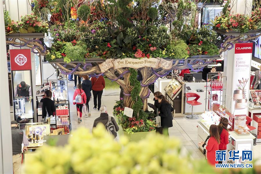 在美国纽约曼哈顿,人们参观梅西花展。一年一度的梅西花展于3月25日至4月8日在位于纽约曼哈顿先驱广场的梅西百货商场举行,根据童话故事设计的众多鲜花装置和珍奇植物景观将商场装扮成春意盎然的童话世界。新华社记者王迎摄