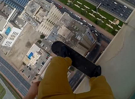 视频显示,尼基塔滑着滑板上了摩天大楼。然后,他站在放在大楼边缘的滑板上,似乎没有一丝恐惧。在一个镜头中,他甚至在靠近大楼边缘的地方做了一次前滚翻,然后坐在了大楼边缘,双脚从边缘垂下,晃来晃去。