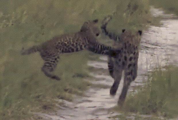 【环球网综合报道】即便是动物世界也会上演孩子惹恼父母的情景,顽皮的猎豹幼崽也不例外。据英国《每日邮报》4月24日报道,近日,一则视频拍摄到了南非朱马禁猎区(Djuma Game Reserve)一对花豹母子互动的温情一幕,视频中,母豹桑迪(Thandi)被突然跳出草丛的顽皮幼崽吓了一跳,场面引人发笑。