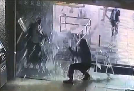 大楼内的监控视频显示,该男子跑着向大楼“出口”冲去,谁知这个“出口”实则是一道玻璃门,结果玻璃门被撞碎了,撒了满地。