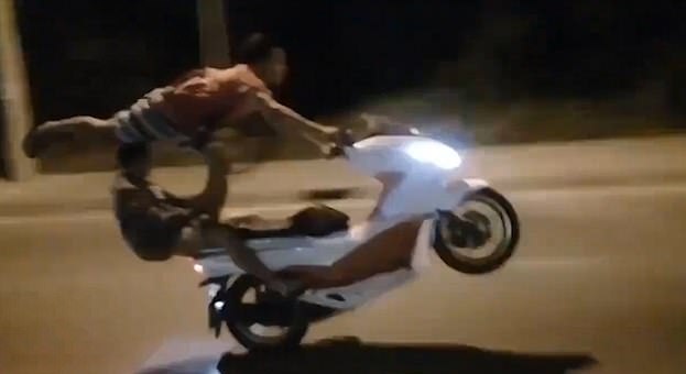 【环球网综合报道】据英国《每日邮报》5月1日报道,4月29日晚11点,越南首都河内的街头上演了惊心动魄一幕,一名男子单脚踩在摩托车上表演特技,后座乘客则抓着他的小腿。