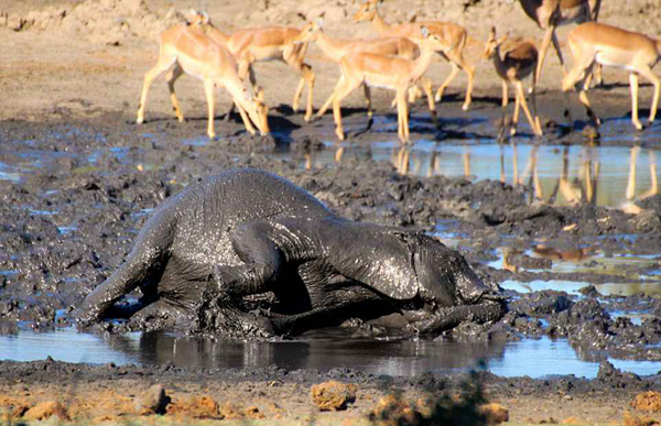 炎炎烈日下,南非克鲁格国家公园里的小水洼为大象、黑斑羚、长颈鹿和狒狒等各种动物们提供了清凉的饮用水。对于这只路过的小象来说,尽管没有足够的饮用水,但这却成了它夏日消暑和嬉戏玩耍的小水池。画面中的小象浑身沾满泥巴,几乎“隐形”在泥地中,但它对自己的“新肤色”毫不在乎,继续不亦乐乎地打着滚,留下一脸茫然的黑斑羚在身后呆呆地观望着。