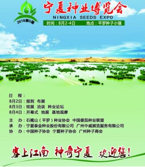 2018年第5届宁夏种业博览会于8月2日—4日在宁夏平罗种子小镇举行,本届博览会得到中国种子协会、宁夏种子协会、广州种子商会的大力支持。博览会坚持创新办展,以田间展示、馆展洽谈、行业论坛相结合,集产品展示、技术交流、招商引资为一体。旨在搭建全国性的展示和交流平台, 推动种业前沿技术创新和重大成果转化示范,加强全国种业技术交流,推进相互间的共赢合作。