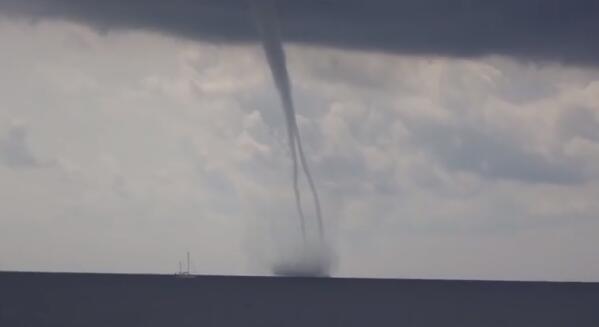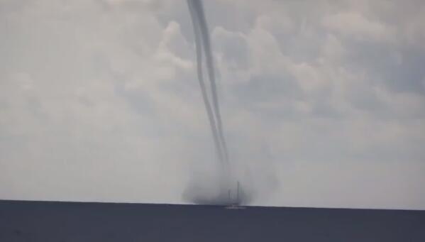 画面中显示,海面上一条巨大的龙卷风,渐渐地分成了罕见的两条龙卷风,一艘行进的游艇驶过,惊险地接近龙卷风边缘,差点被卷入。幸运的是,这艘游艇安全地从龙卷风旁边离开。