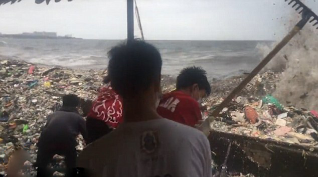 为了清理这些堆积成山的垃圾,一群环保俱乐部的年轻人手持工具,非常艰难地在开展工作,他们每清理完一些垃圾,就会有更多的垃圾被卷到岸边。
