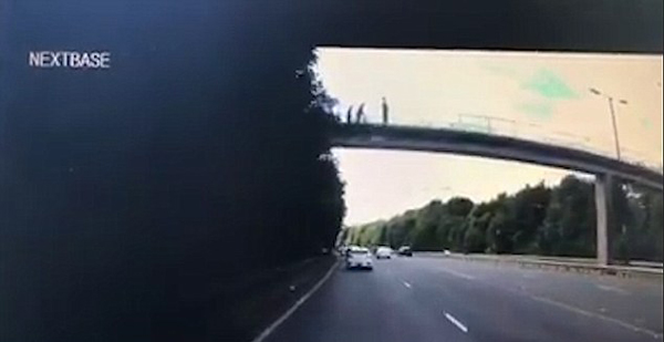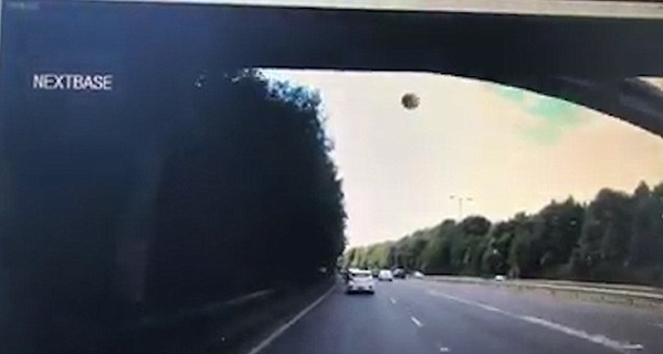 该汽车的行车记录仪拍摄下了这个过程。在视频中,该汽车正要驶过一座人行天桥,桥上站着3个人,他们掐准时机扔下一个像足球一样的巨大的圆形物体,该物体狠狠地砸到了汽车的挡风玻璃上,司机明显受到了惊吓。警方将这一危险的视频发布在推特上,发表声明称当事司机受到严重惊吓,并向公众征集有助于调查这一事件的任何信息。