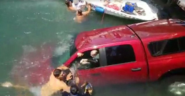 在营救视频中,可以听到琼斯正在描述该起事故的救援过程。当他走近码头时,很多旁观者正在观看着救援工作。几名好心人跳入海中,将年迈的母亲从车窗内拉到安全的地方。一名男子一边帮助这位母亲,一边告诉司机:“如果车继续往下沉,你得自己从窗户爬出去,好吗?你明白不?”当母亲被从窗户里成功救出时,旁边一个人说道,“接住狗!接住狗!”狗被递出窗外后,车似乎开始完全沉入海中。