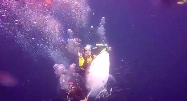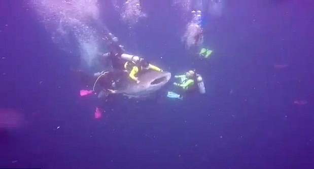 视频显示,其中一名潜水员躺在鲸鲨的背上,一边抓住鲸鲨头部的两侧,一边做出“OK”的手势,另外两个人则紧紧抓住鲸鲨的侧面。