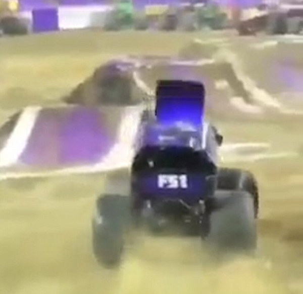 画面一开始,赛车手驾驶着这辆紫色巨轮卡车来到离观众最近的一个U型滑道前,并向观众展示了一个,的前空翻。赛车手接着一个急转向,将车子开向赛场,,打算再来一个空翻。没想到刚驶过一个陡坡,由于车速过快、,不稳,车身渐渐向左倾斜,随即侧翻倒地。但这似乎并没有难倒赛车手,只见其继续发动引擎,使整个卡车背部贴地,接着加足马力,一鼓作气,顺利将卡车翻了回去。