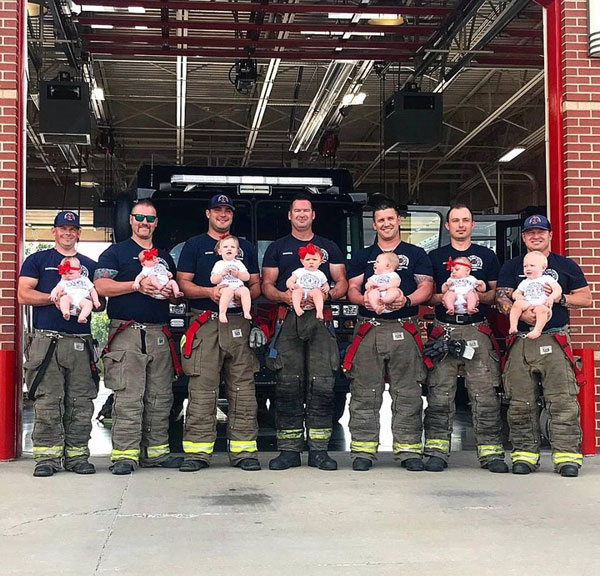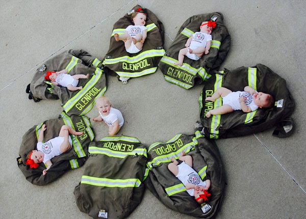 今年5月,来自俄克拉荷马州格伦浦市同一部门的7名消防员也在短时间内接连迎来了他们各自的孩子。他们穿着制服与孩子们合影留念。这几对父母还拍摄一组只有婴儿的镜头,其中6个孩子穿上了父亲的制服,而第7个孩子则坐在空地上笑着对着镜头。照片分享到网络后,收到了1800多条评论,网友们纷纷表示:“他们太可爱了,简直是在犯罪!”