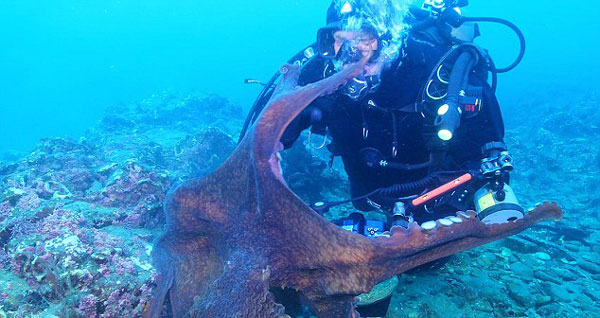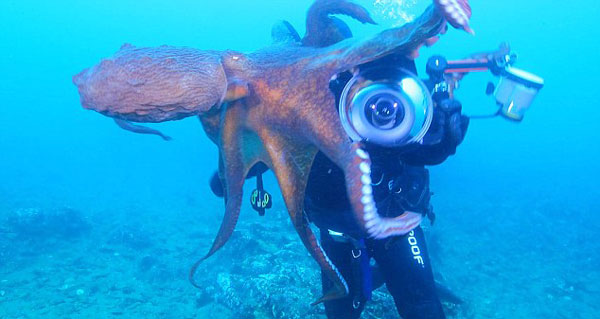 视频中,与鲁达同行的潜水员正扛着摄像机,慢慢凑近一只正蜷缩在礁石上小憩的巨型红色章鱼。章鱼似乎感到有东西在靠近,便警觉地睁开眼,瞥见了身旁的潜水员。只见章鱼瞬时伸出一只触角,缠住潜水员的手,接着借力起身,舒展开所有触角,包住摄像机,并缠住他的脖子。潜水员正想拍摄特写镜头,便也没做抵抗,任由章鱼扒在摄像机上。