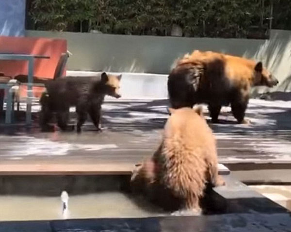 【环球网综合报道】据英国《每日邮报》8月30日报道,近日,一段视频显示,在美国加利福尼亚帕萨迪纳市,一只棕熊妈妈带着两只幼崽在一户人家后院的喷泉里嬉笑打闹,以躲避夏日的炎热。屋内的两只狗看到熊在享受,便开始吠叫以示抗议。最终,熊妈妈只好不情愿地从喷泉离开。