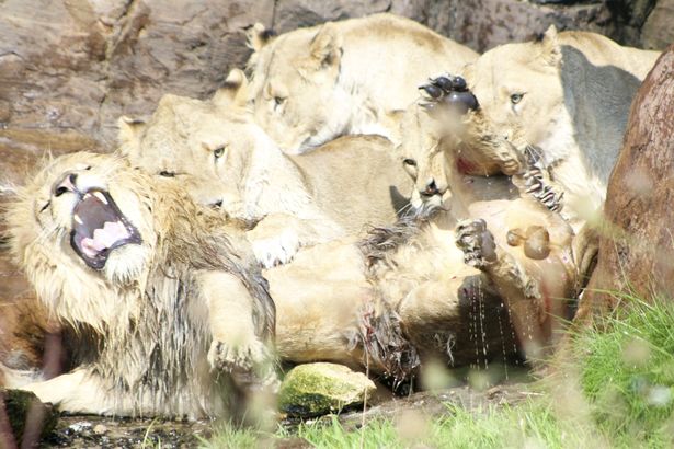 【环球网综合报道】据英国《镜报》9月6日报道,近日,游客在英国西米德兰兹郡野生动物园内拍到了令人心惊肉跳的一幕:一群母狮子猛扑到一只雄狮身上,用有力的爪子牵制住雄狮,并用牙齿狠狠地啃咬它的后背,看起来想要置这位,于死地,而雄狮似乎无力招架同伴的围攻,只能发出痛苦的咆哮。