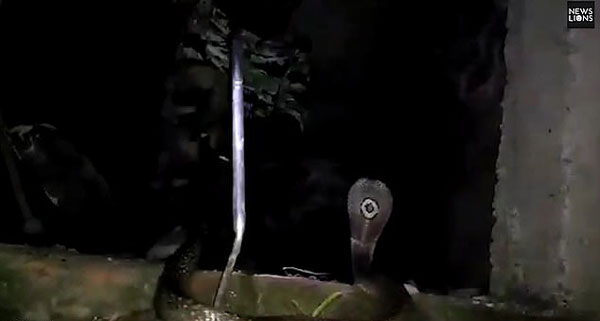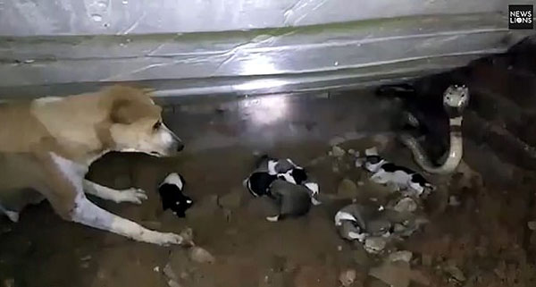 视频显示,在巴德拉克区的一个仓库里,一条眼镜蛇脑袋直立,紧盯着与它对峙的母犬,随时准备发起攻击。地上几只幼犬紧紧地依偎在一起,而一旁则散落着3只孤零零的幼犬,看上去已经失去了意识。一名男子用铁棍去拨动它们,想看看是否还有生命迹象。其中一只幼犬醒了过来,嘤嘤地向其他幼犬爬去,引起了眼镜蛇的突击。见状,母犬立即上前对眼镜蛇一阵狂吠。眼镜蛇也毫不退让,不断向它发起攻击。