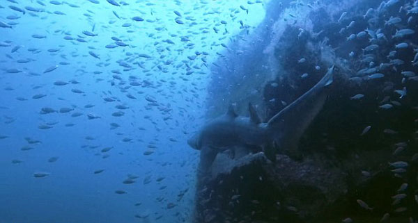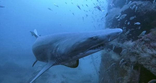 视频中显示,先是一群浅色的小鱼在沉船附近游来游去。3秒后,当镜头向左转动时,一条鲨鱼出现在画面中。就这样,毫无戒心的科莱特与鲨鱼有了一场面对面的偶遇。然后鲨鱼做了一个缓慢的转弯,它向科莱特展示出它尖尖的牙齿后才游走。