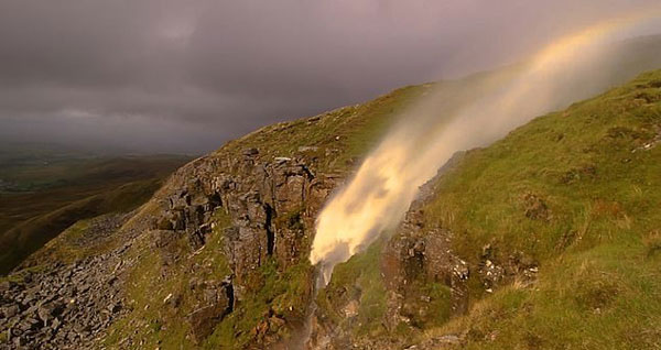这段视频拍摄于坎布里亚郡的一处山顶,当时风暴已经达到了顶峰,风速高达80英里(约129千米)。而当太阳照在被吹倒流的瀑布上时,水面上出现了一道彩虹。