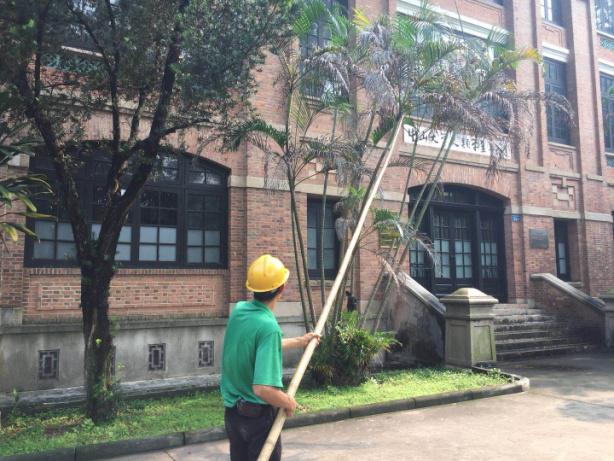 现马丁堂为中大人类学系日常办公所用,中航物业提供该办公楼宇的外围卫生保洁、周边树木修枝等服务。(图为马丁堂周边修枝,增强建筑景观的同时,从绿化养护方面保护建筑外围、屋檐不被破坏。)