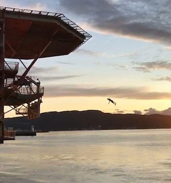 【环球网综合报道】据英国《每日邮报》9月28日报道,近日,在挪威特隆赫姆市,一名男子为寻求刺激从海边一座21米高的直升机停机坪上表演后空翻三周跳水,结果出现失误,以背部入水,他同行的朋友拍下了这惊险的一幕。