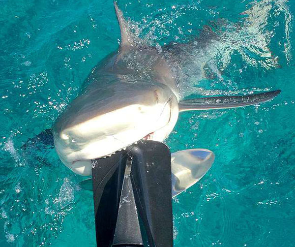 这名渔夫来自巴哈马的伊柳塞拉岛,当时正在附近海域钓梭鱼,不料竟钓到一条柠檬鲨。他发现这条鲨鱼上钩后,便立即上前打算割断鱼线。这时,柠檬鲨却不请自来,一口咬住渔船的引擎,迟迟不肯松口。