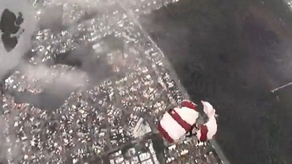 视频中,四名跳伞员排成三行,正试图摆好教练要求的队形,但强风肆虐,四人的身体都在不停地摇晃着。风越来越猛烈,最下边一行的跳伞员支撑不住,被强风刮离队伍。随后,第二行右侧的跳伞员被强风带跑,该跳伞员立即拉绳调整降落伞方向,却不料撞上身旁的队友,两个降落伞随即纠缠在一起,两人身体也不受控制,随即疾速下坠。在距地面700米处时,这两名训练有素的跳伞员运用其求生技能,立刻切断身上的降落伞,互相推开至适当距离,打开备用伞,,安全降落在海湾附近的市郊居民区内。