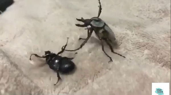 两只甲虫的斗角十分激烈,战况堪比美国职业摔跤赛现场。视频,,弱势的甲虫不得不认输投降,从地毯下灰溜溜地逃走了。(实习编译:陶佳琪 审稿:朱盈库)
