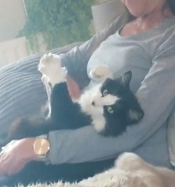 霍莉•汤普金斯(Holly Tompkins)当时正躺在沙发上,她对身边另一名女子怀中抱的自己的宠物猫喊了一声“米妮鼠”,它便转身向她“招手”,霍利忍不住大笑起来。她说这个黑白相间的小家伙总是这么做。